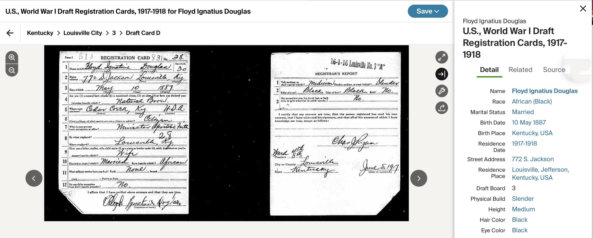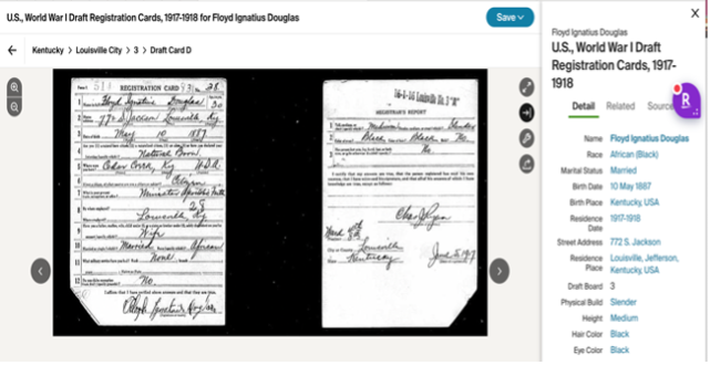 Floyd Ignatius Douglas was born on May 10, 1887, in Nelson County, Kentucky, the son of Bettie Troutman and Charles Ignatius Douglas (1863–1897). His grandparents were Ignatius A. Douglas (1827–1866) and Ara Ann Rapier Douglas (1828–1902). His great-grandparents were Nace Douglas (1800–1879) and Henrietta Dorsey Balm (1805–?), often referred to as “Henny.”